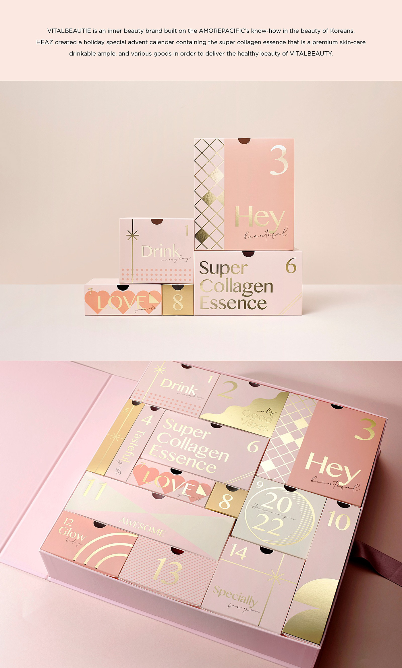VITALBEAUTIE 是建立在愛茉莉太平洋在韓國人美容方面的專業知識的內在美容品牌。 HEAZ 制作了一個假期特別日歷化妝品及美容飲品包裝設計,其中包含作為高級護膚飲用劑的超級膠原蛋白精華和各種商品,以提供健康的 VITALBEAUTY之美。