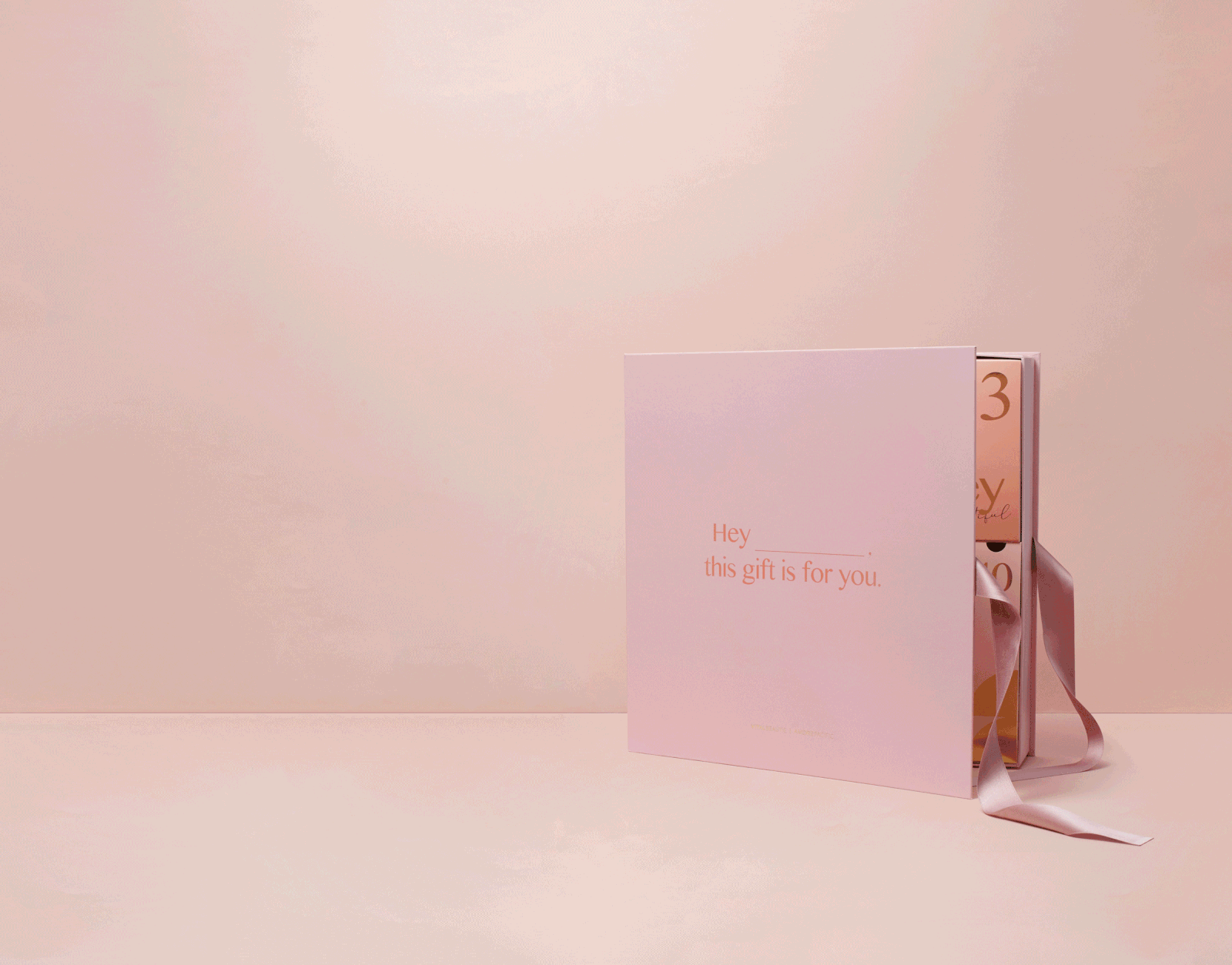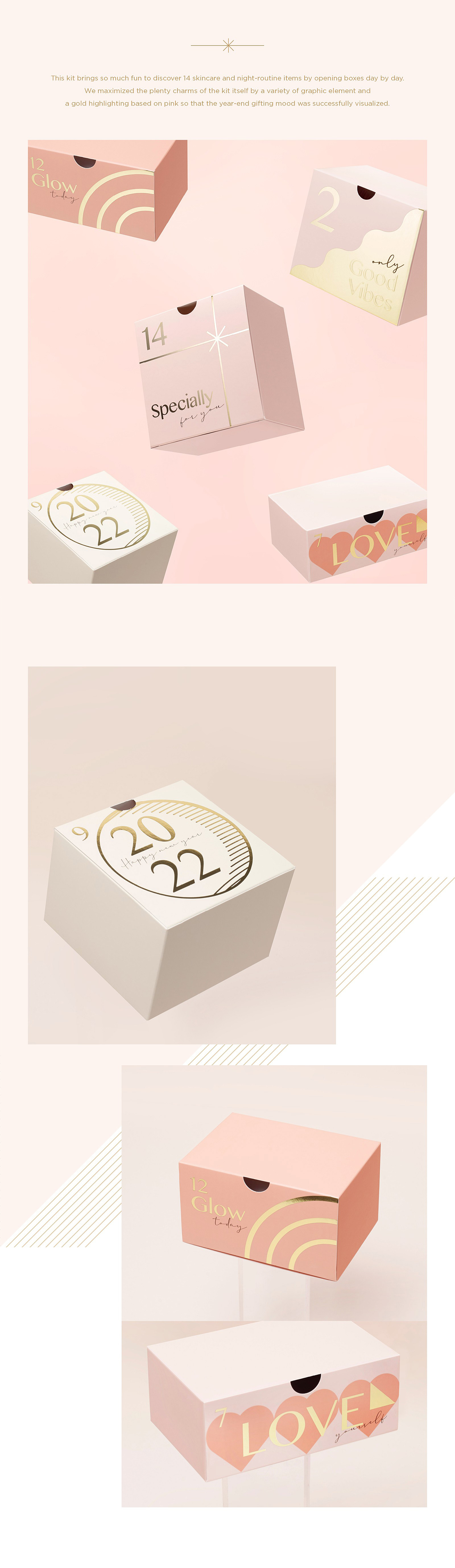 這款套裝每天打開盒子,發現 14 款護膚品和日常用品,帶來無窮樂趣我們通過各種圖形元素和以粉色為基礎的金色突出顯示,最大限度地發揮套裝本身的豐富魅力,讓年終送禮心情 成功可視化。