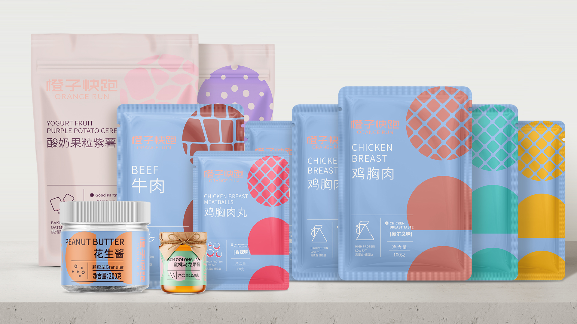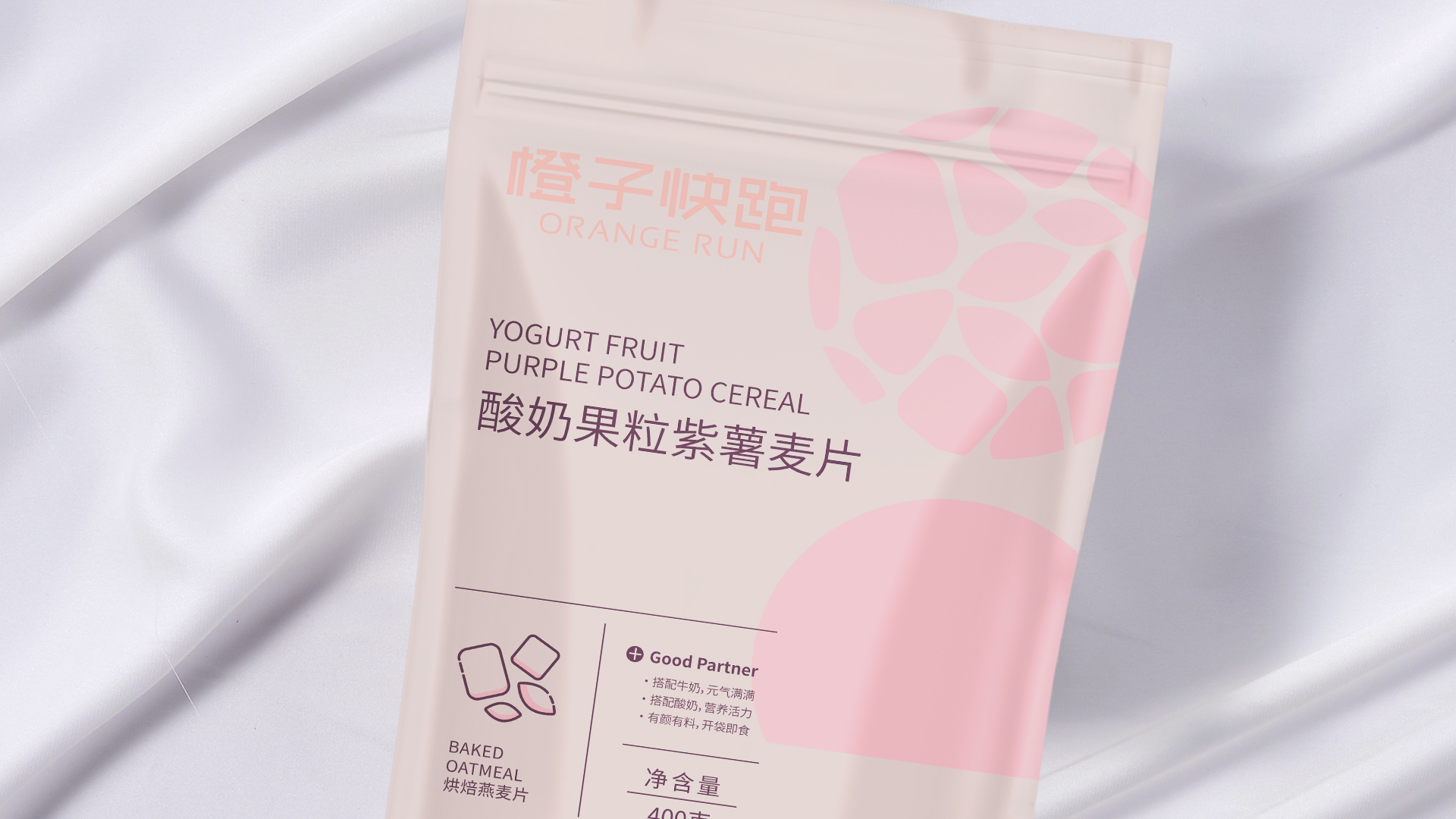 橙子快跑一向以提供健康減脂為理念,基于此,朝歌針對現代人群對飲食安全性、健康性的高需求與高要求,以及現代女性追求自然健康而食用果蔬的心理需求,在進行包裝形象規劃時,將谷物與新鮮果蔬的多纖維營養概念相結合,打造出“健康代餐”新概念。
