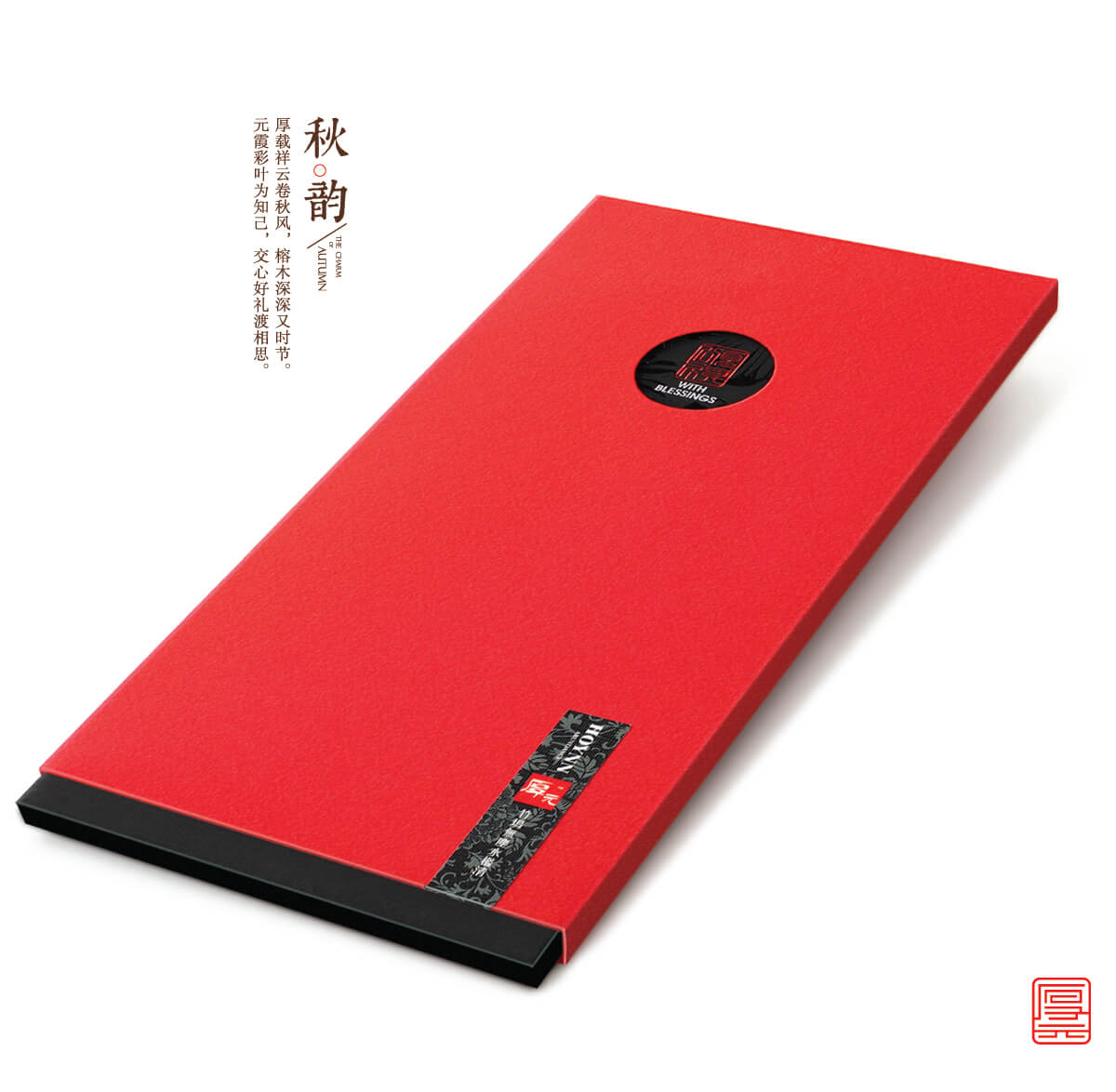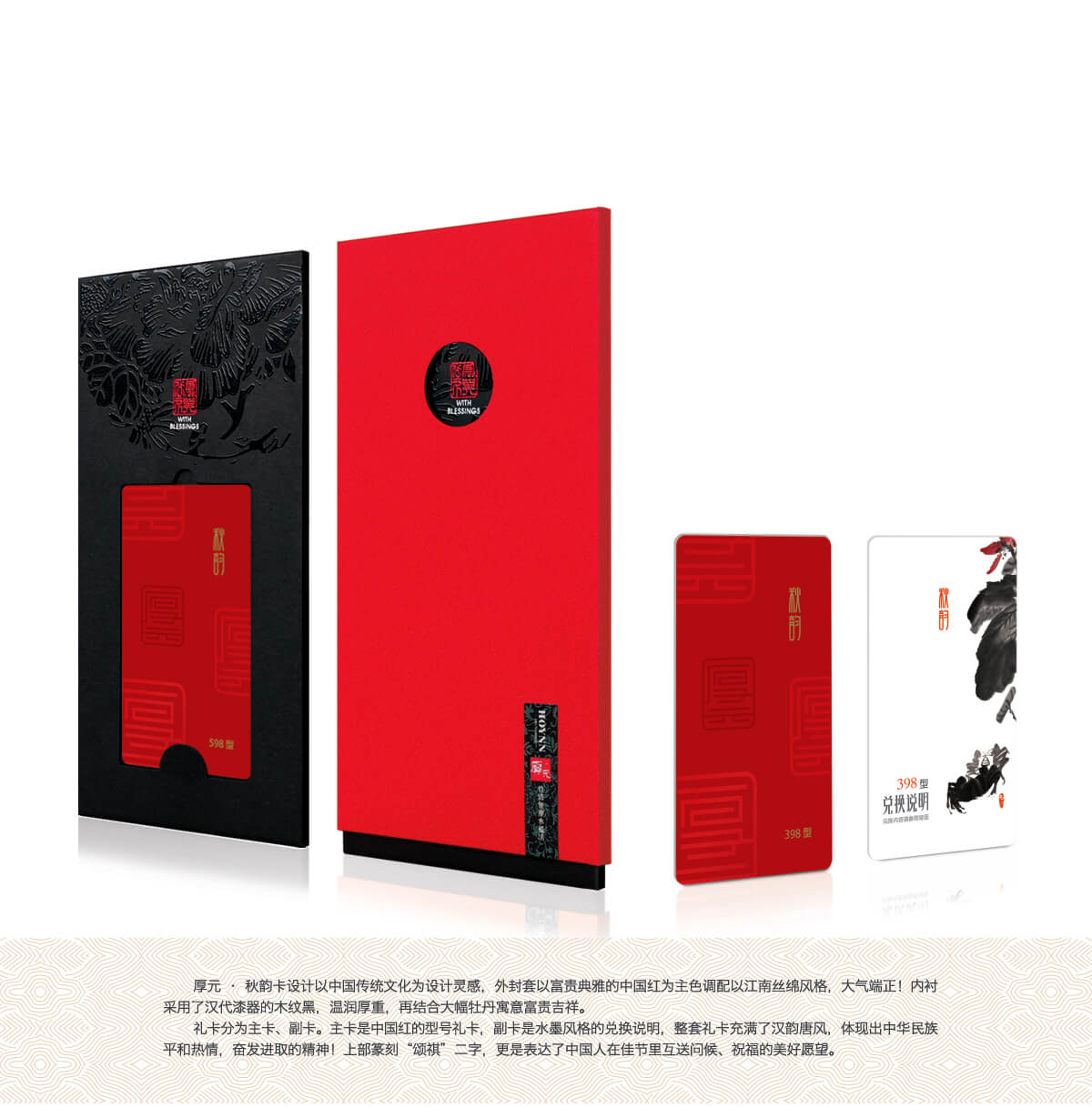 厚元 秋韻卡設計以中國傳統文化為設計靈感,外封套以富貴典雅的中國紅為主色調配以江南絲綿風格,大氣端正!內襯采用了漢代漆器的木紋黑,溫潤厚重,再結合大幅牡丹寓意富貴吉祥。